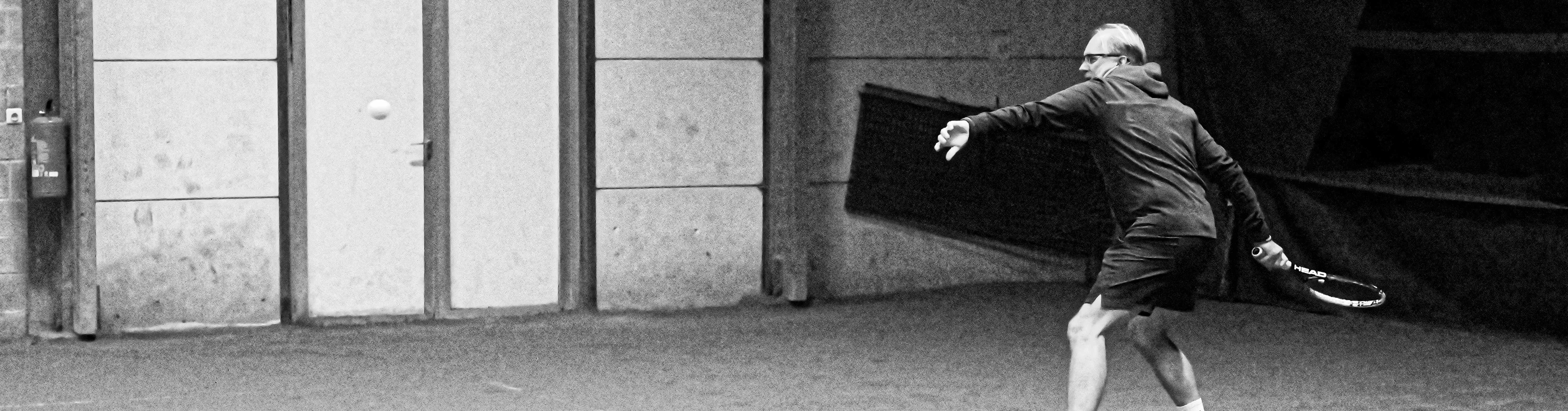 Onderstaande (ervaren) speler heeft zijn raket in de juiste handgreep. Het hoofd kordaat opgericht naar boven om er straks een goeie patat op te geven. De oogjes op scherp. Het buikje netjes ingetrokken.
